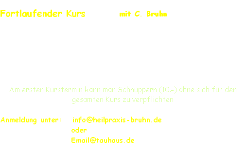 PMR ist eine Entspannungstechnik, die Dich zu wohltuender Ruhe und Gelassenheit führt! Du erlernst im Kurs Übungen zur Anspannung und Lockerung verschiedener Muskelgruppen, die Du dann ohne fremde Hilfe und großen Aufwand zu Hause anwenden kannst. Weitere Hinweise zur Progressiven Muskelrelaxation bekommst Du auf der Webseite der veranstaltenden Dozentin C. Bruhn: www.heilpraxis-schoemberg.de