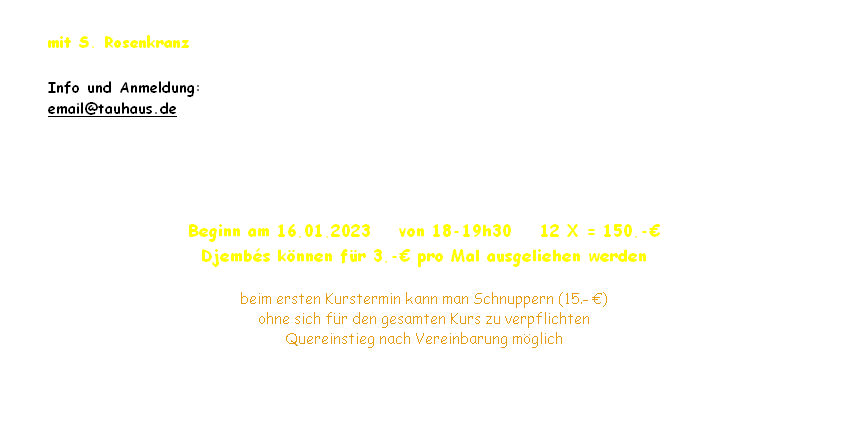 Du erlernst ohne Stress die Schlagtechnik für die Djembé mit den drei Grundqualitäten „Bass, Open und Slap“, das Bedienen der Basstrommel mit einem Schlegel in jeder Hand für das Spielen auf dem Fell bzw. ihrer Metallglocke. Wie im Handumdrehen geraten die ersten Anfänge zu einem begeisternden Ausflug in das Reich der (traditionellen und selbsterfundenen) Rhythmen!